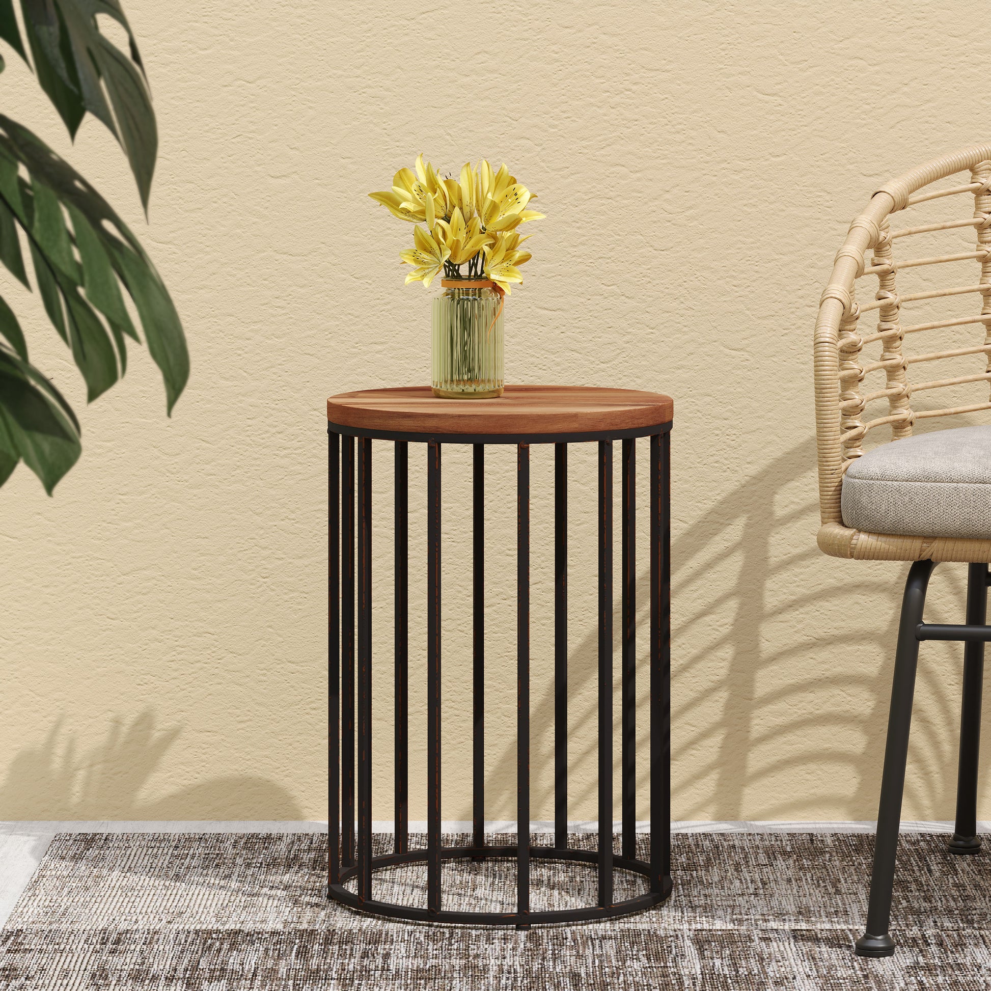 This modern farmhouse-inspired outdoor side table adds some rustic charm to your patio or garden space. The table features a round solid wood top with an antique finish, while the iron frame provides a contrasting black/brown base. We love that the cylindrical design creates a visually appealing silhouette, making it a great addition to your outdoor seating area. Water-resistant, this side table is easy to maintain with a simple wipe using a cloth and mild soap. It makes a great companion to your favorite porch reading chair.