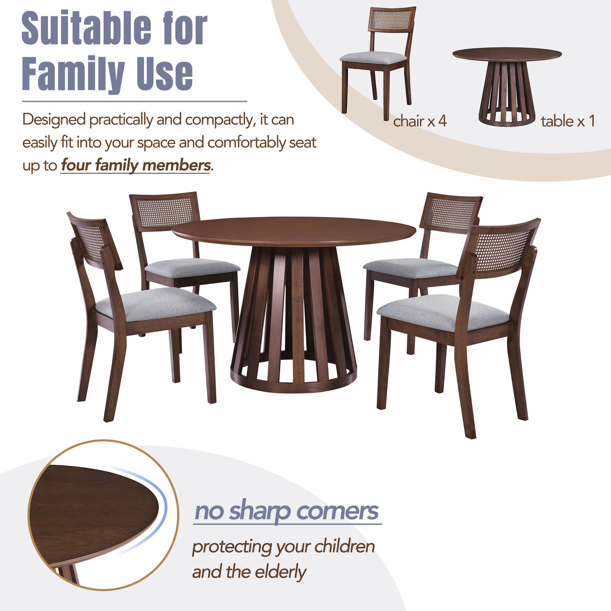 Product Name:TREXM 5-Piece Retro Dining Set with 1 Round Dining Table and 4 Upholstered Chairs with Rattan Backrests for Dining Room and Kitchen (Walnut)