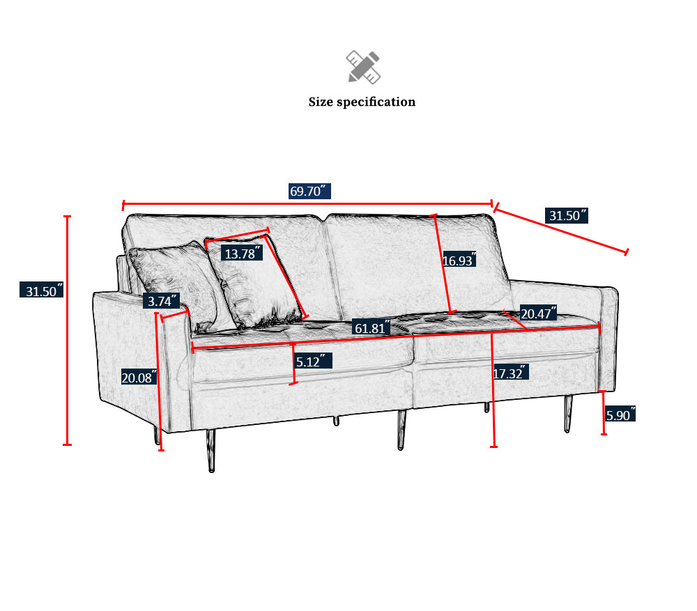 70'' Modern button tufted sofa with 2 throw pillows for living room