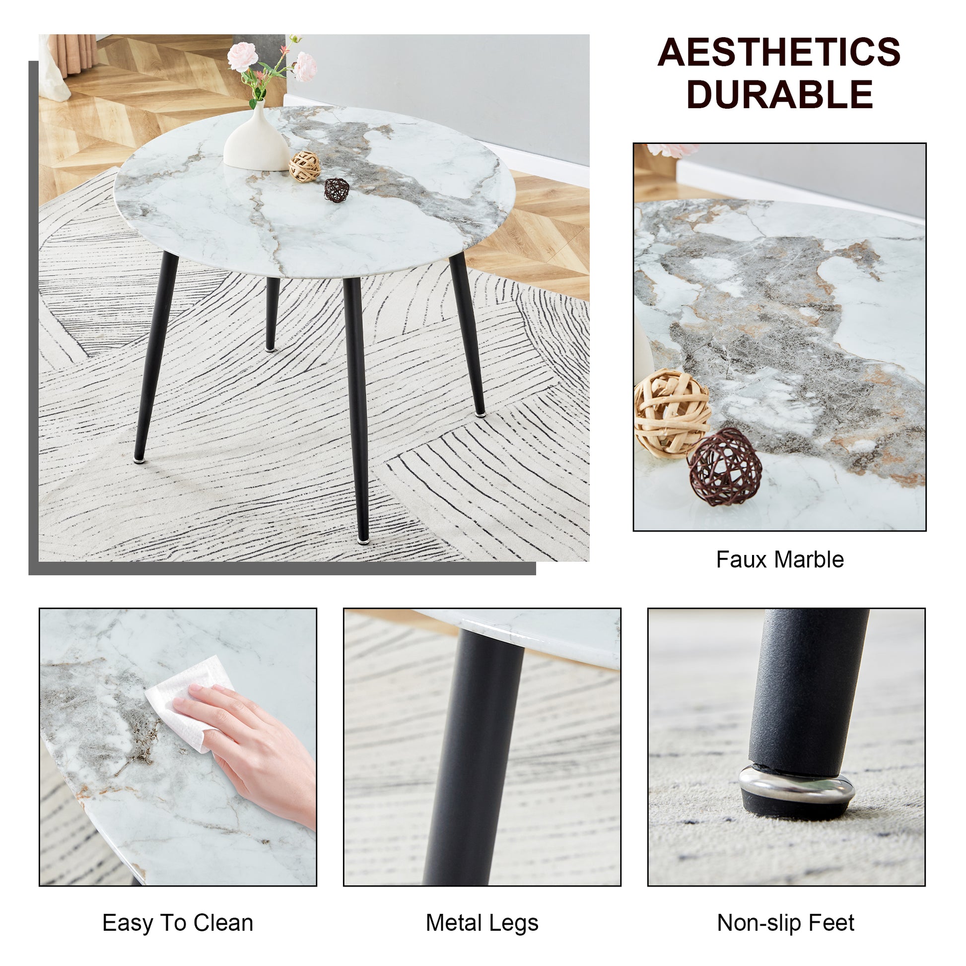 Product Name:A modern minimalist circular dining table with a diameter of 40 inches, a 0.3 inch thick imitation marble pattern tabletop and black metal legs 40 '* 40' * 30 'DT-1164