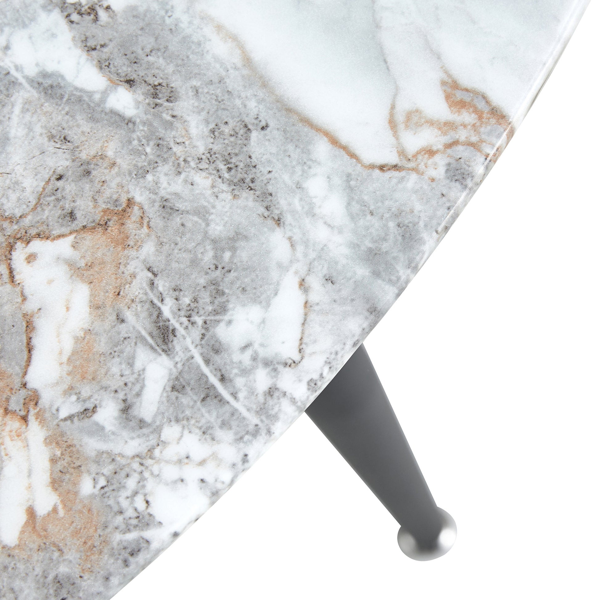 - The characteristic of this table is a marble style sticker glass tabletop with four black metal legs, and the clean interior design adds a fashionable style.