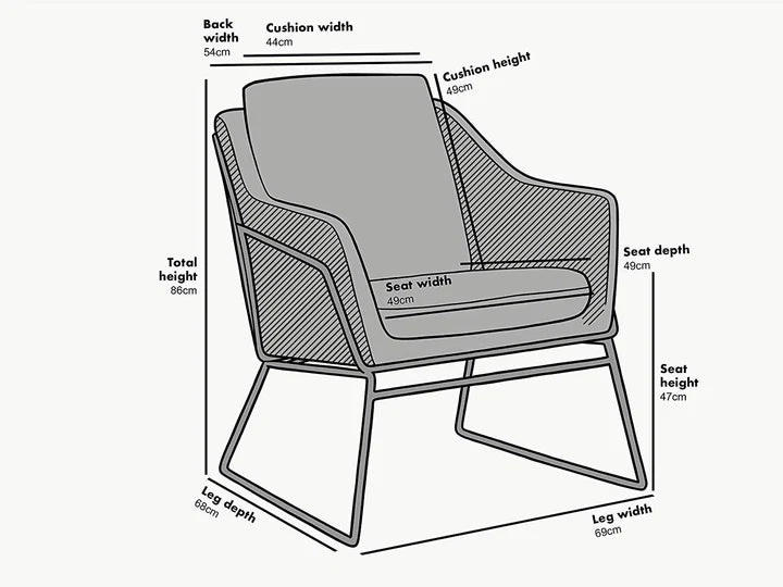 - Product Specifications - Seat height: 47 cm - Seat depth: 49 cm - Seat width: 49 cm - Armrest height: 28 cm - Back height: 49 cm - Back width: 54 cm