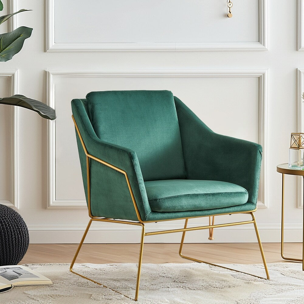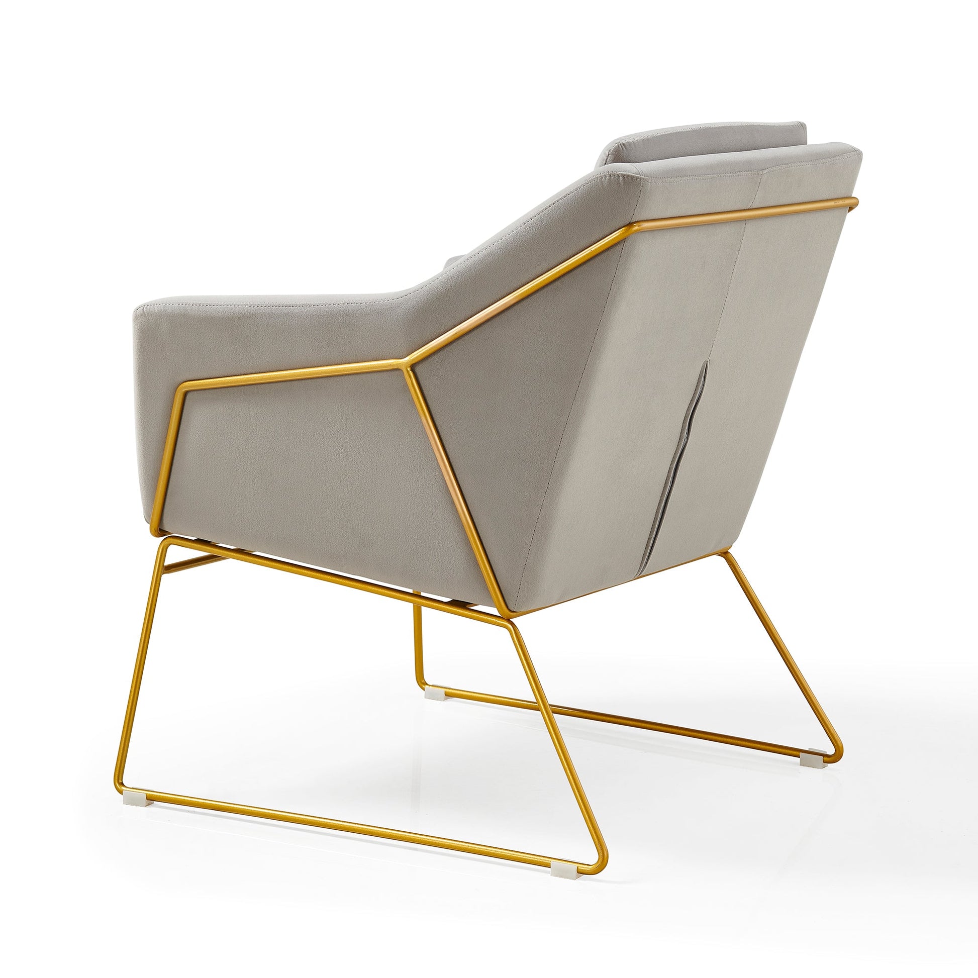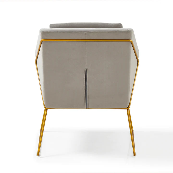 - Our armchair boasts retro vibe with opulent velvet effect fabric and contemporary sculptural golden colour coated stainless steel frame.