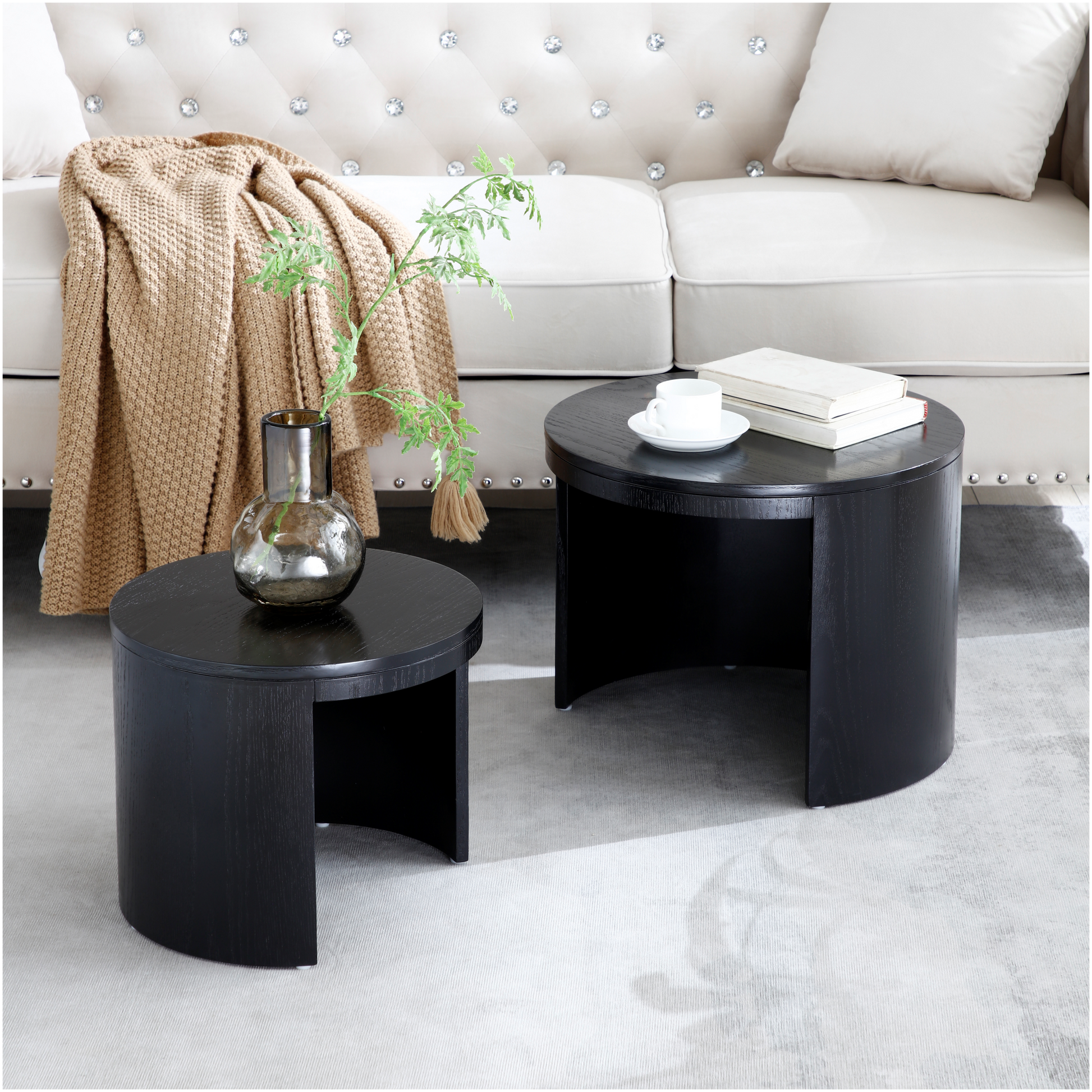 The set includes two different-sized tables - which can be used as a side table and a coffee table - and stackable tables.Accent your living space with these side tables. They nest neatly together or work wonderfully apart—an extra measure of elegance. Features Perfect technology - the high-end + oak welt technology is adopted. The manual welt has no gap and presents a perfect radian, which makes this sidetable stand out.Various functions - the sidetable can be used as a tea table in the living room to drink tea and receive guests, as a bedside table in the bedroom to hold bedside supplies, as a leisure side table in the courtyard, or as a footstool of a chair or bed. It has various functions and is flexible.