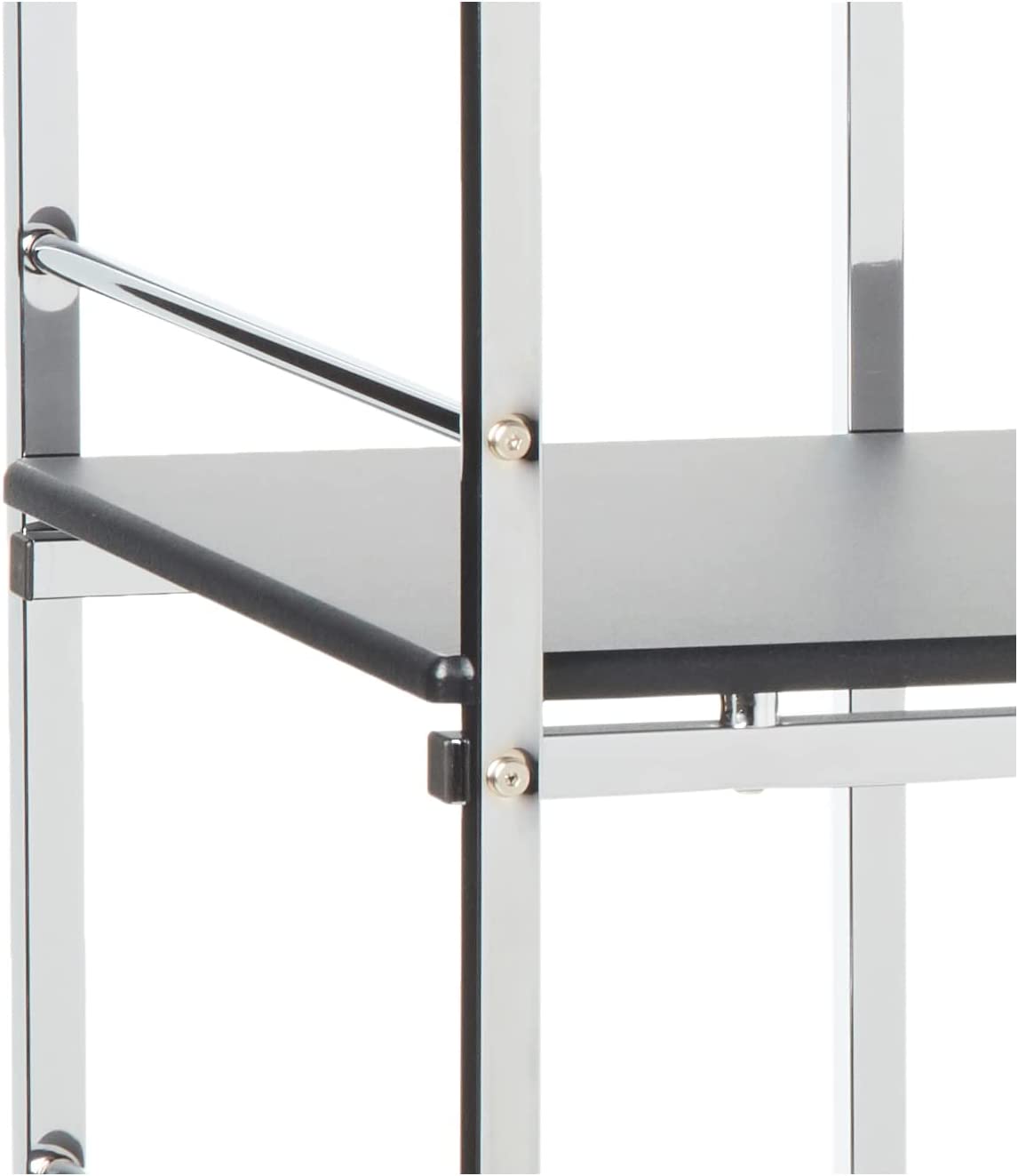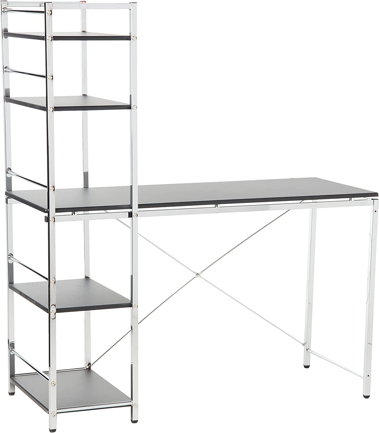 Elvis Chrome plated computer desk is a contemporary addition to your workspace. This desk has a black finish with chrome base, and with its built in book case for storing your books, CDs, and other necessities, this desk is sure to upgrade any room. One side the wide black wood desktop with plenty of room for using your laptop, writing, or studying, while on the other side is a five shelf black glass book shelf with bar backstops to hold all your books and studying materials. Some Assembly Required.