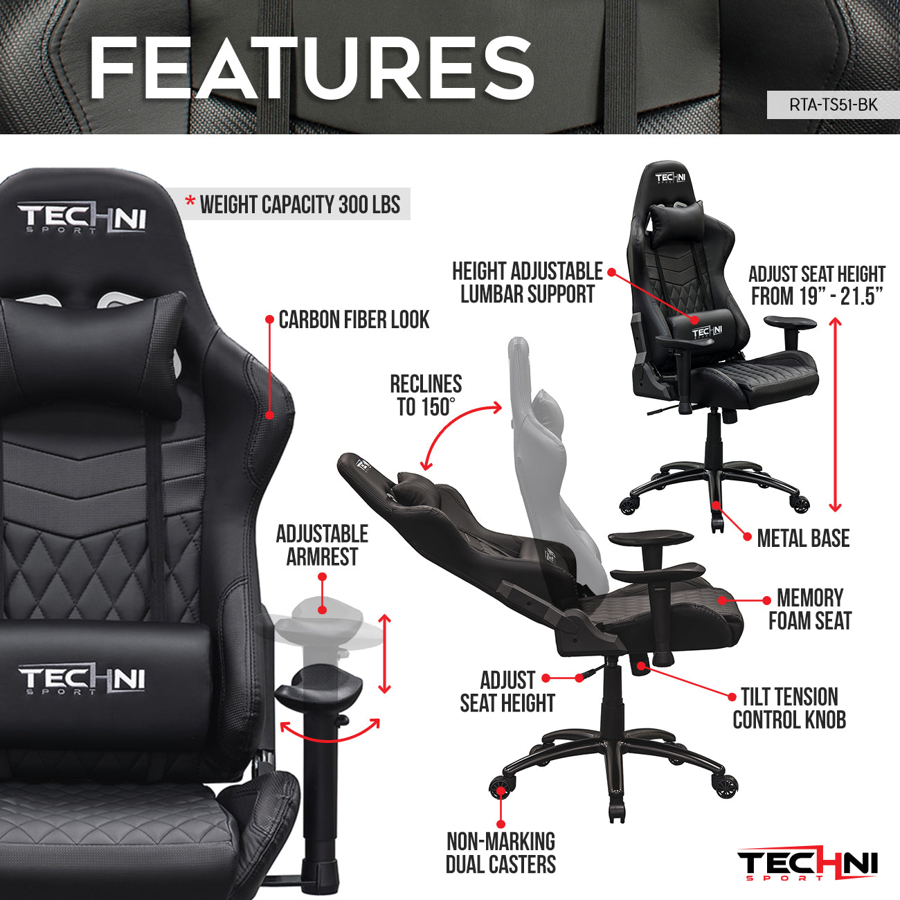 The Techni Sport TS-5100 Ergonomic Office High Back Computer Racing Gaming Chair will put the pedal to the metal on productivity in any office or game room. Unlike regular office chairs, it gives an eye catching racer style appearance and modern look to spruce up any environment. With the cool resemblance of a sport's car interior, let your imagination "race" as you recline and swivel in superb comfort for gaming or work sessions lasting 8 hours or more. This ultimate computer gaming chair is made with synthetic TechniFlex upholstery and features a height adjustable memory foam seat, reclining back mechanism up to 150 degrees, tilt & tension mechanism control, ergonomic and adjustable headrest and lumbar support cushions, height adjustable and swivel armrests, and a durable steel base with non-marking 2" casters. Seat adjusts from 19.5" to 23.5" high. Weight Capacity: 300Lbs. Color: Black