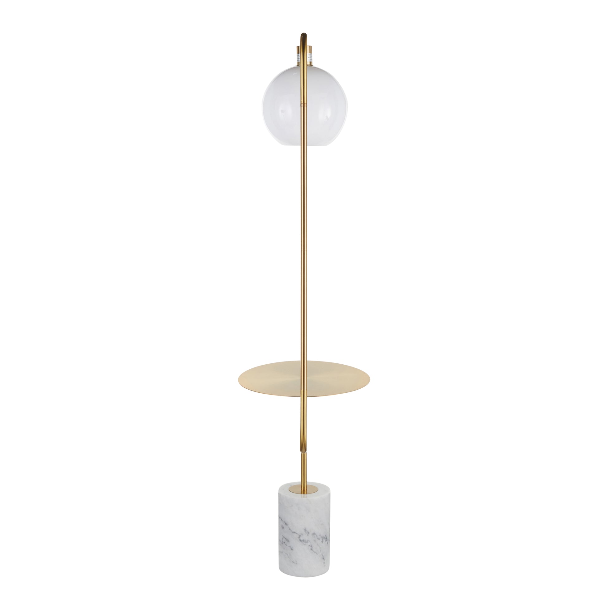 - A mix of marble and metal creates a contemporary look that will fit any room. The Symbol Floor Lamp by Lumisource is the perfect size for smaller spaces. With a gold metal attached table, white round sconce, and a white marble base, the Symbol Floor Lamp will look great next to any sofa, accent chair, or even in a bedroom.