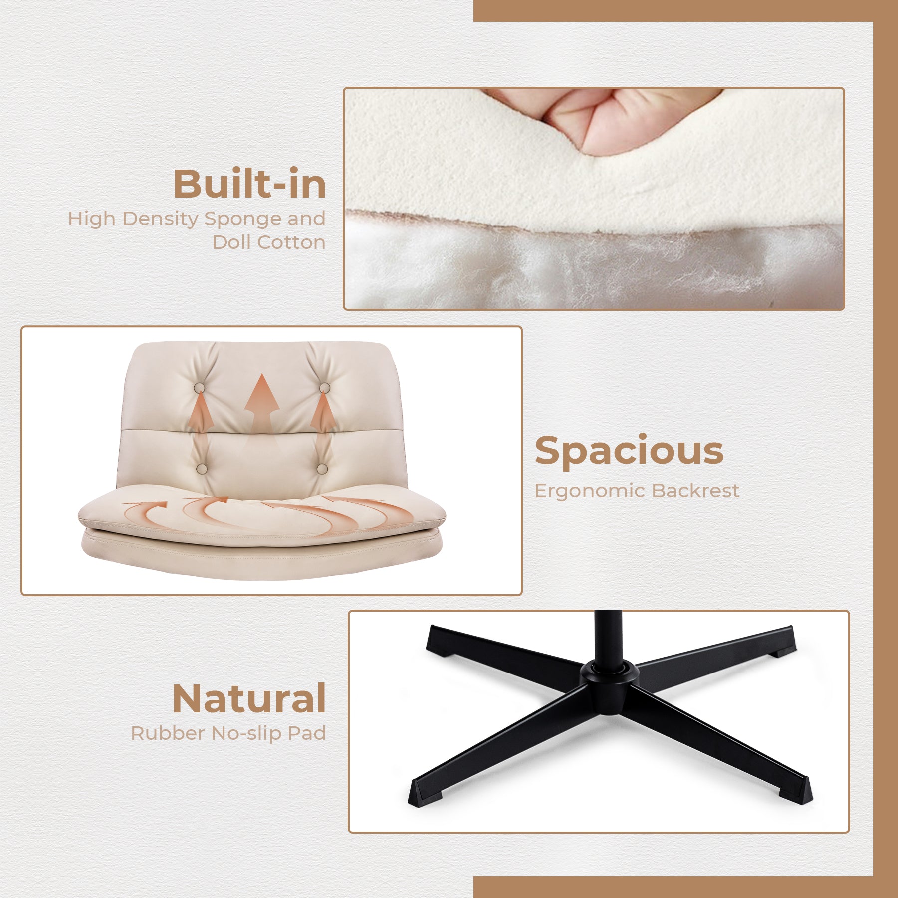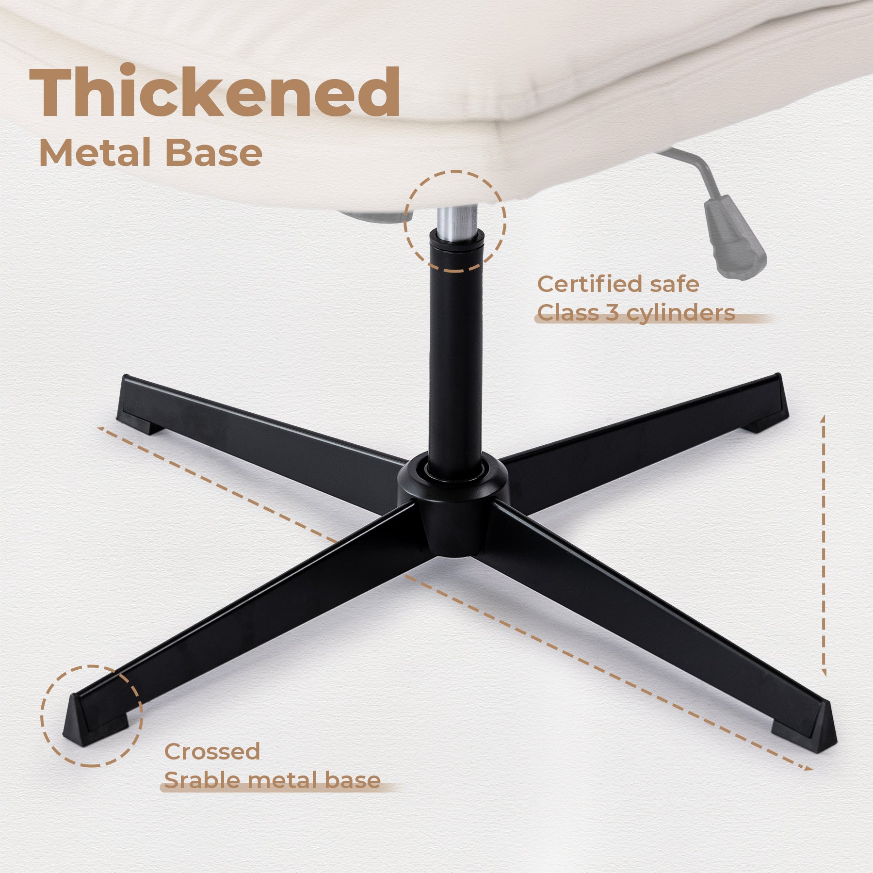Certified with safe class 3 gas lift and painted cross-shaped metal base, each supporting foot is attached with a non-slip natural rubber feet pad to prevent scratching and slipping.