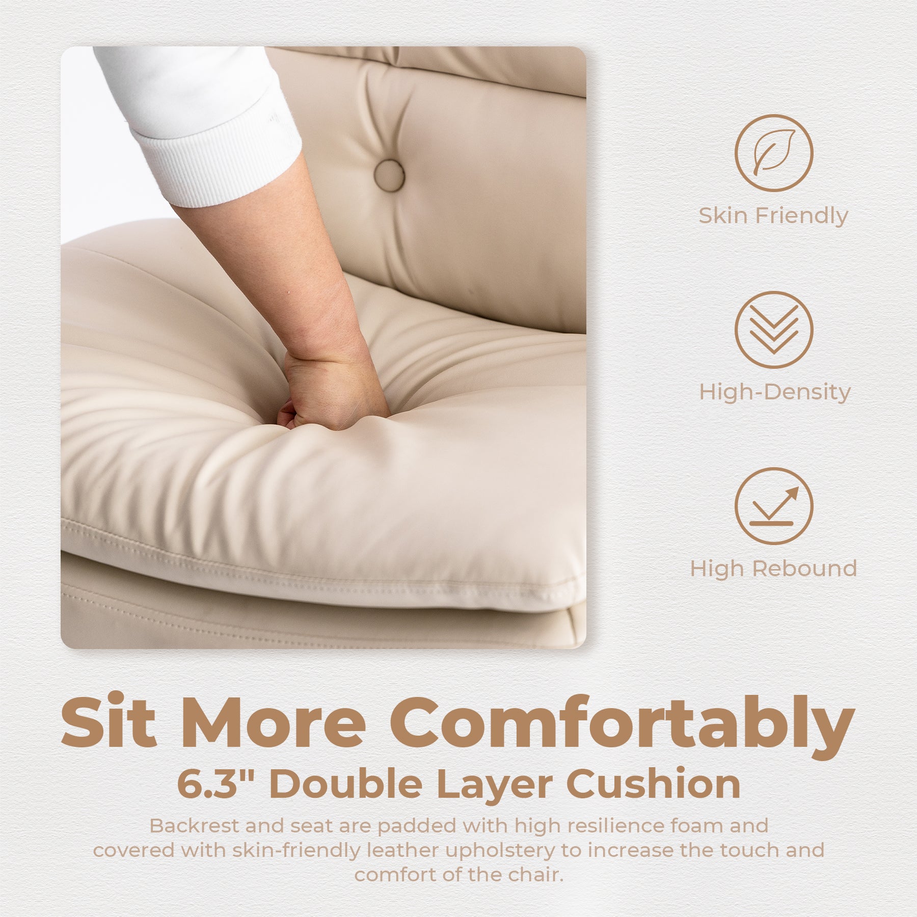 - QUALITY MATERIAL: 6.3" double layer seat cushion with high desity and rebound foam and skin-friendly leather;