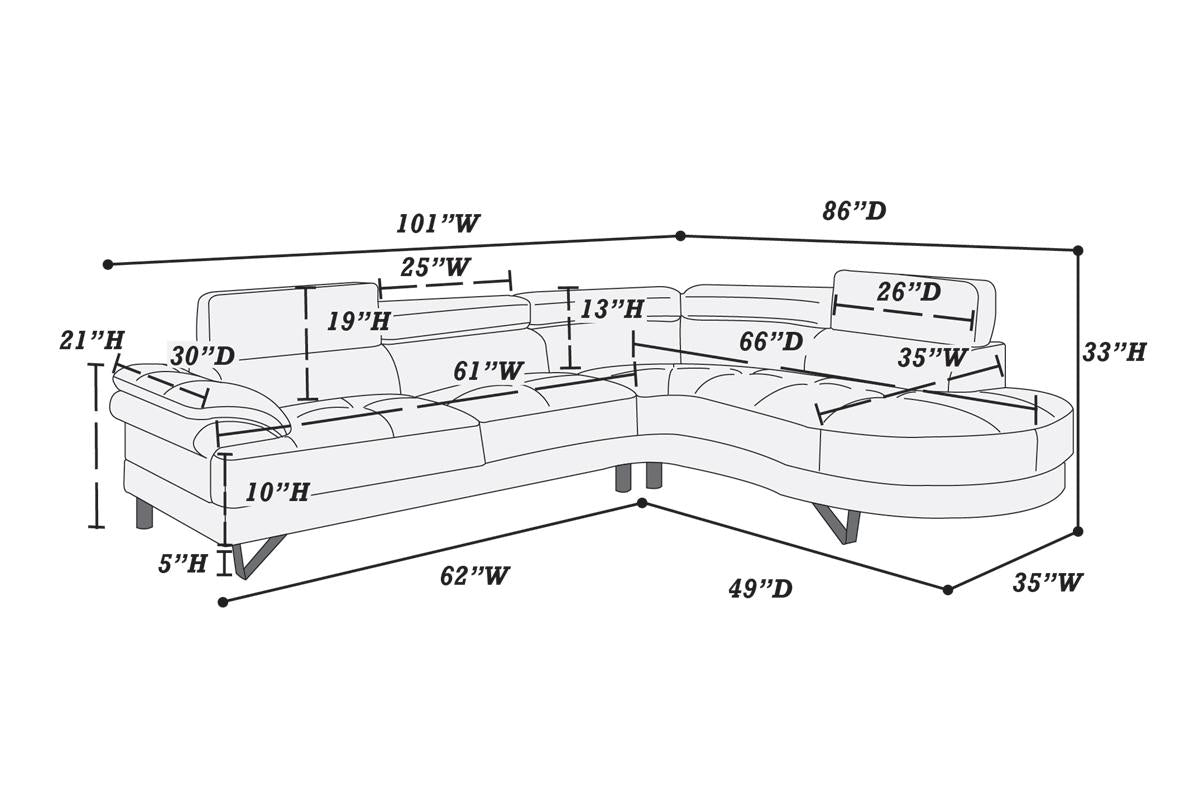 The future meets the present with this luxurious 2-piece sectional covered in a smooth texture with wide seating and armrest. Each back panel is adjustable for comfort and style. Available in light grey (bonded leather) or white (faux leather). Dimensions: Left-facing Sofa :- 64" x 35" x 29" - 34"H Right-Facing Chaise :- 85" x 38" x 29" - 34"H Overall Sectional Dimensions :- 102" x 85" x 29"-34"H Listing Include : 2pcs Sectional Sofa (Right Facing Chaise, Left Facing Sofa) Only. Coffee Table Not Included.