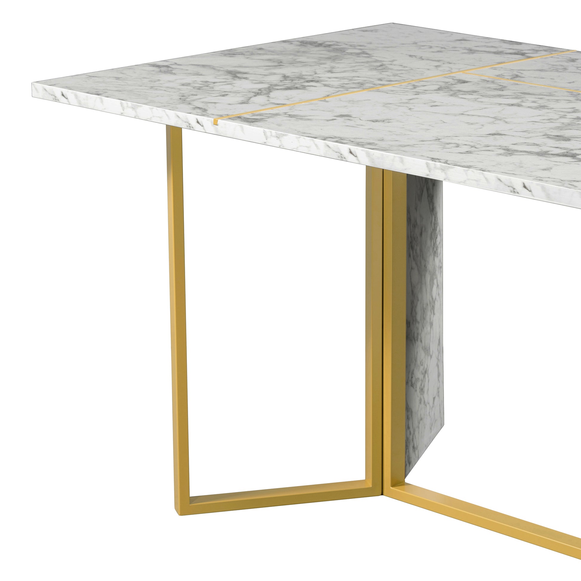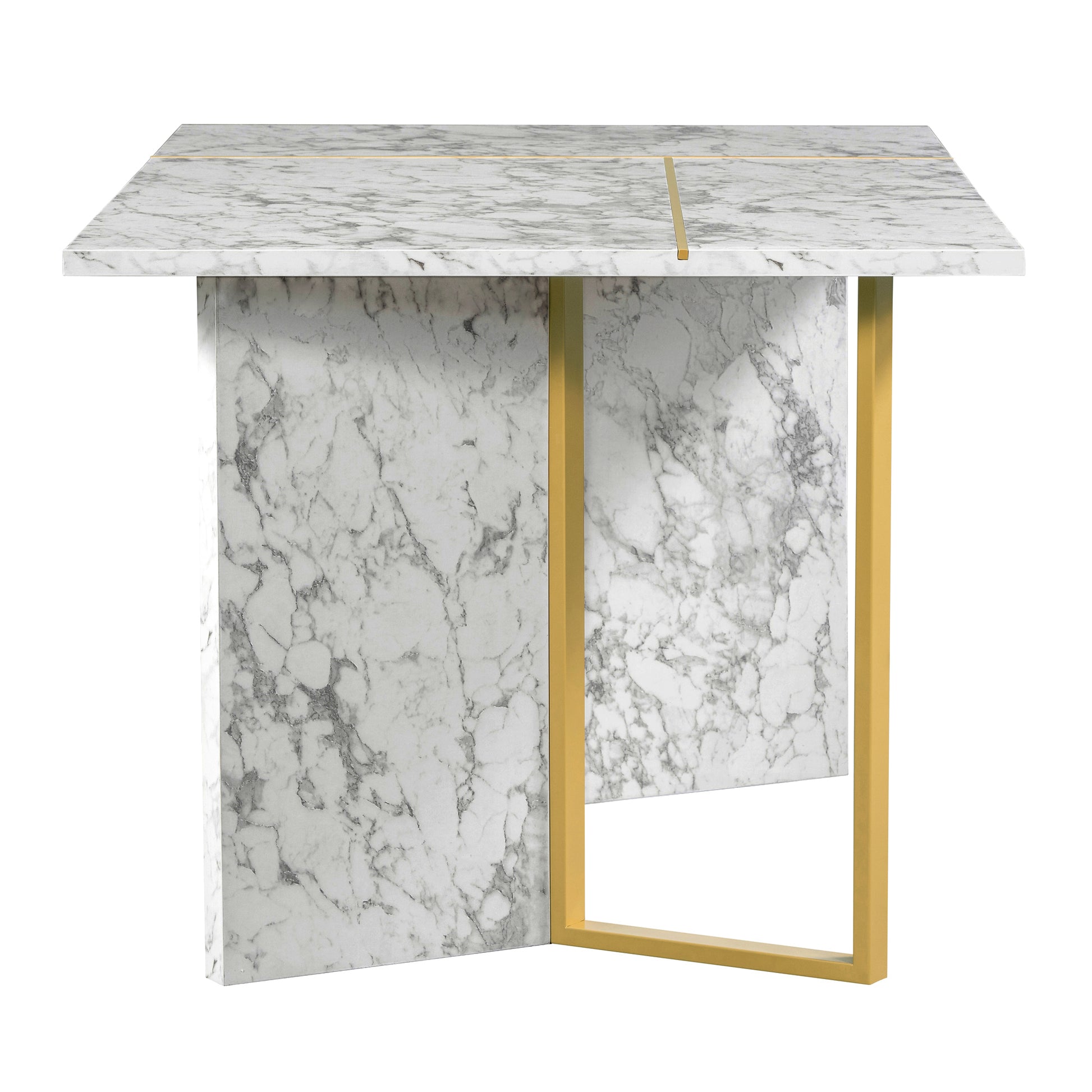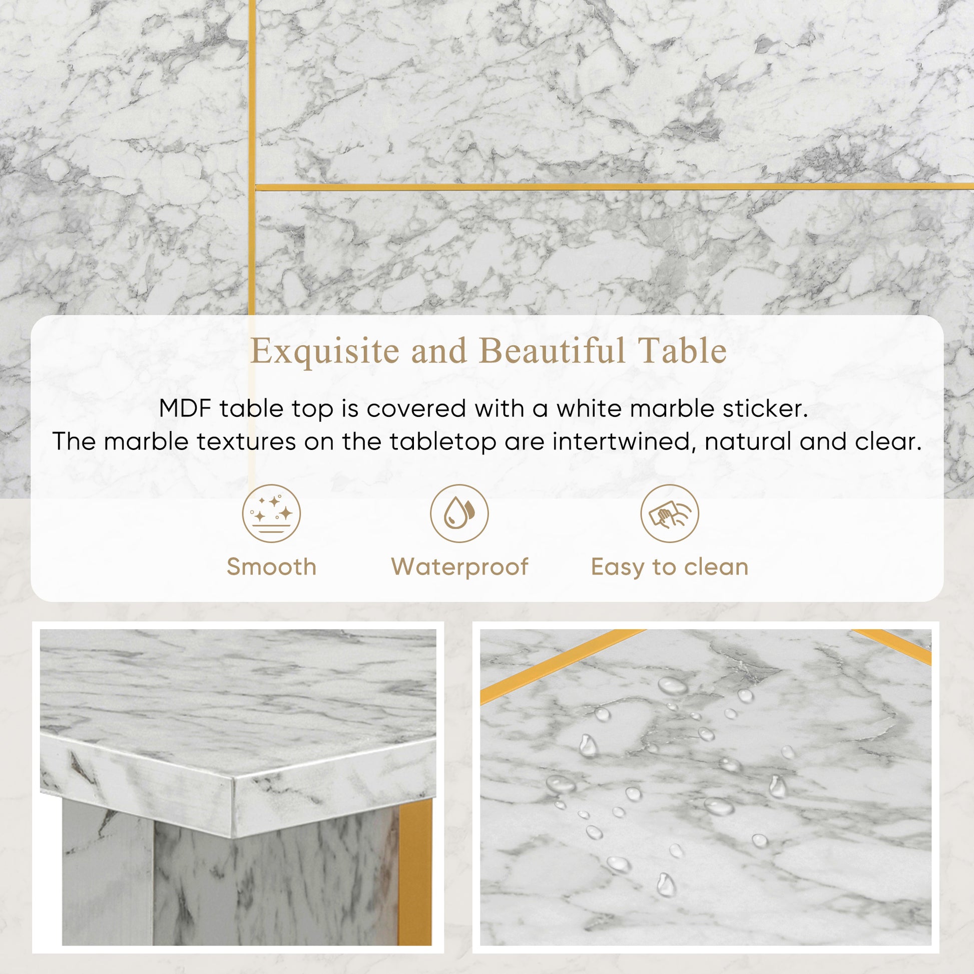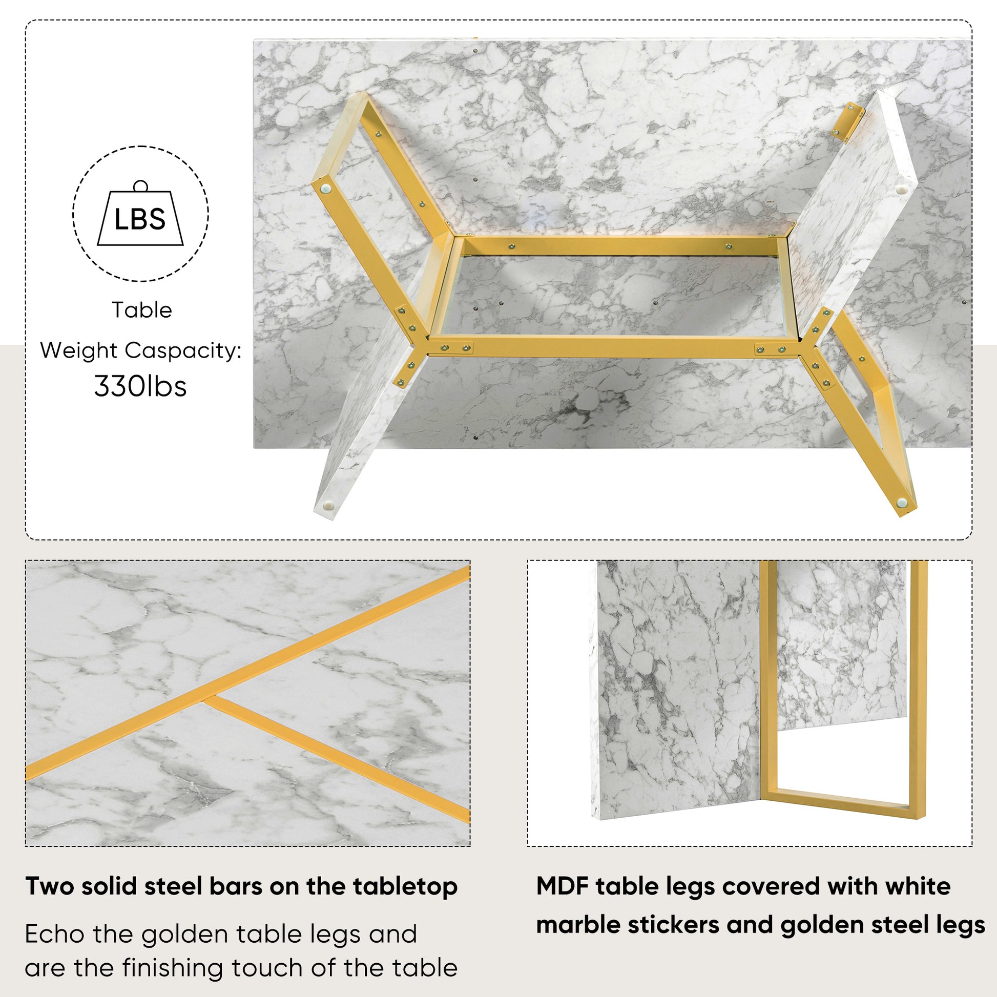 - The material combination of the dining table is amazing. The MDF table top is covered with a white marble sticker. The table legs have two parts. The 42 mm thick MDF table legs covered with white marble stickers and golden steel legs jointly support the entire square tabletop. There are two solid iron bars on the tabletop, which echo the golden table legs and are the finishing touch of the table. The table legs have a solid structure and are very stable, the weight capacity is 330 LBS.