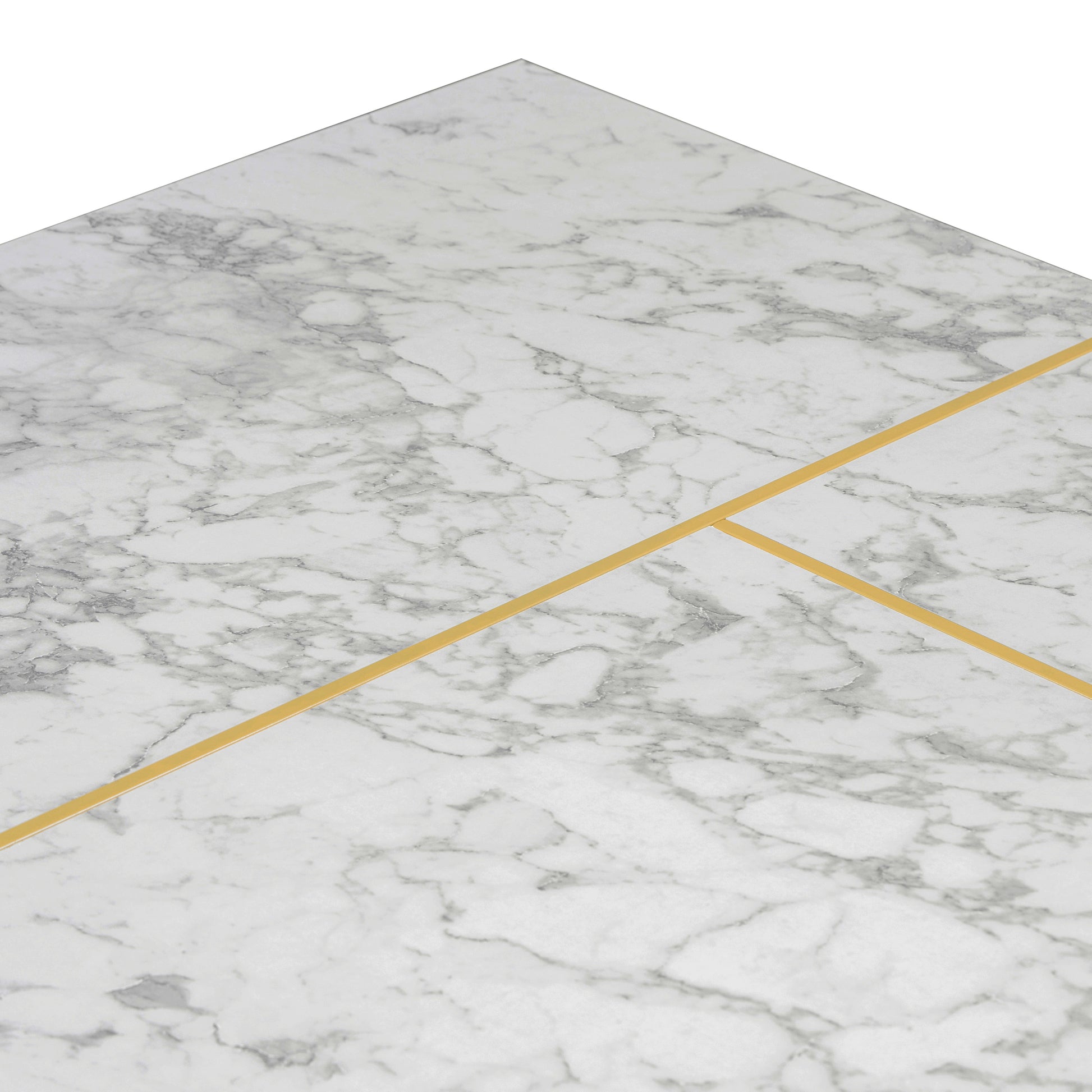 - This luxurious modern dining table can seat 6 people. The MDF tabletop with stunning marble effect exudes opulence and immerses you in elegance. The tabletop with shiny gold steel legs paired with white marble stickers exudes glamour and enhances the modern aesthetic. This table is more than just furniture, it is a statement of refined taste, a charming fusion of luxury and contemporary style. Transform your dining space into a sanctuary for stylish gatherings and unforgettable conversations.