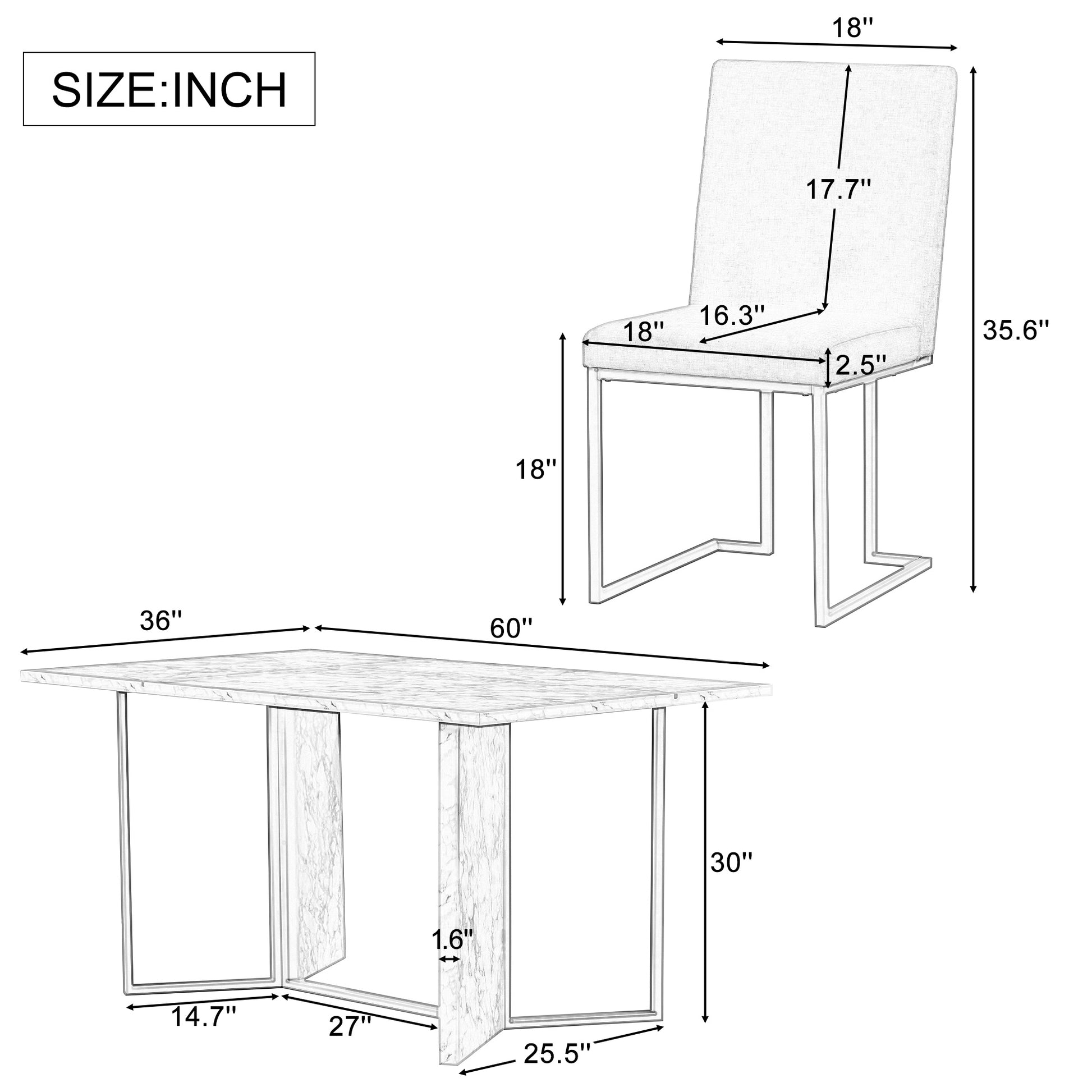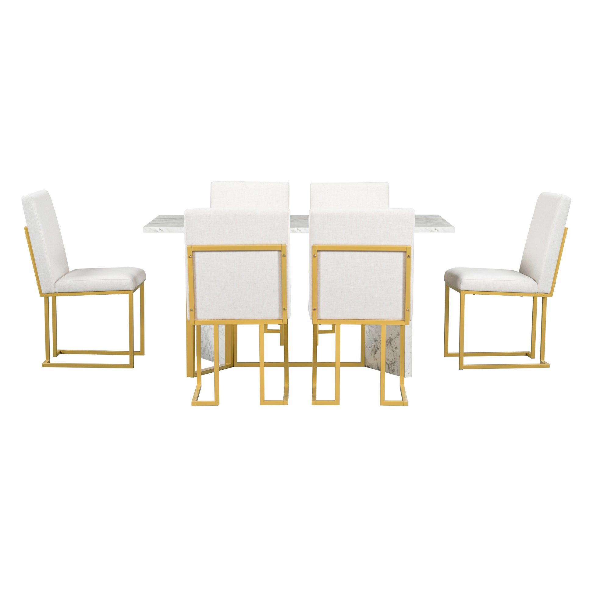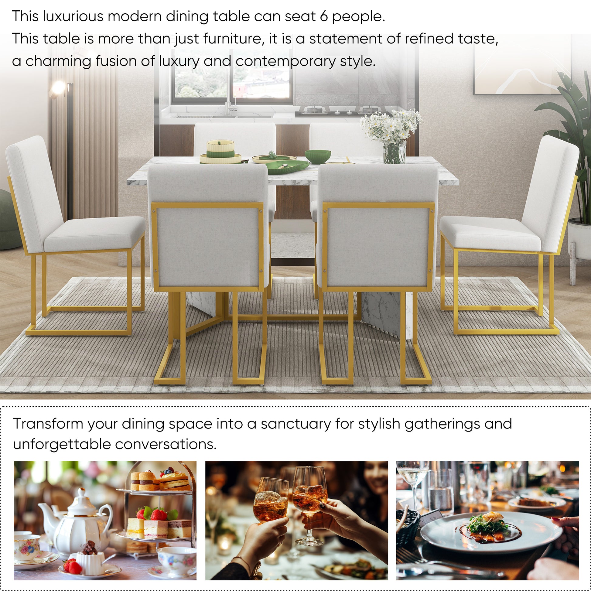 Product Name:TREXM 7-Piece Modern Dining Table Set, Artificial Marble Sticker Tabletop and 6 Upholstered Linen Chair All with Golden Steel Legs for Dining Room and Kitchen (White + Gold)