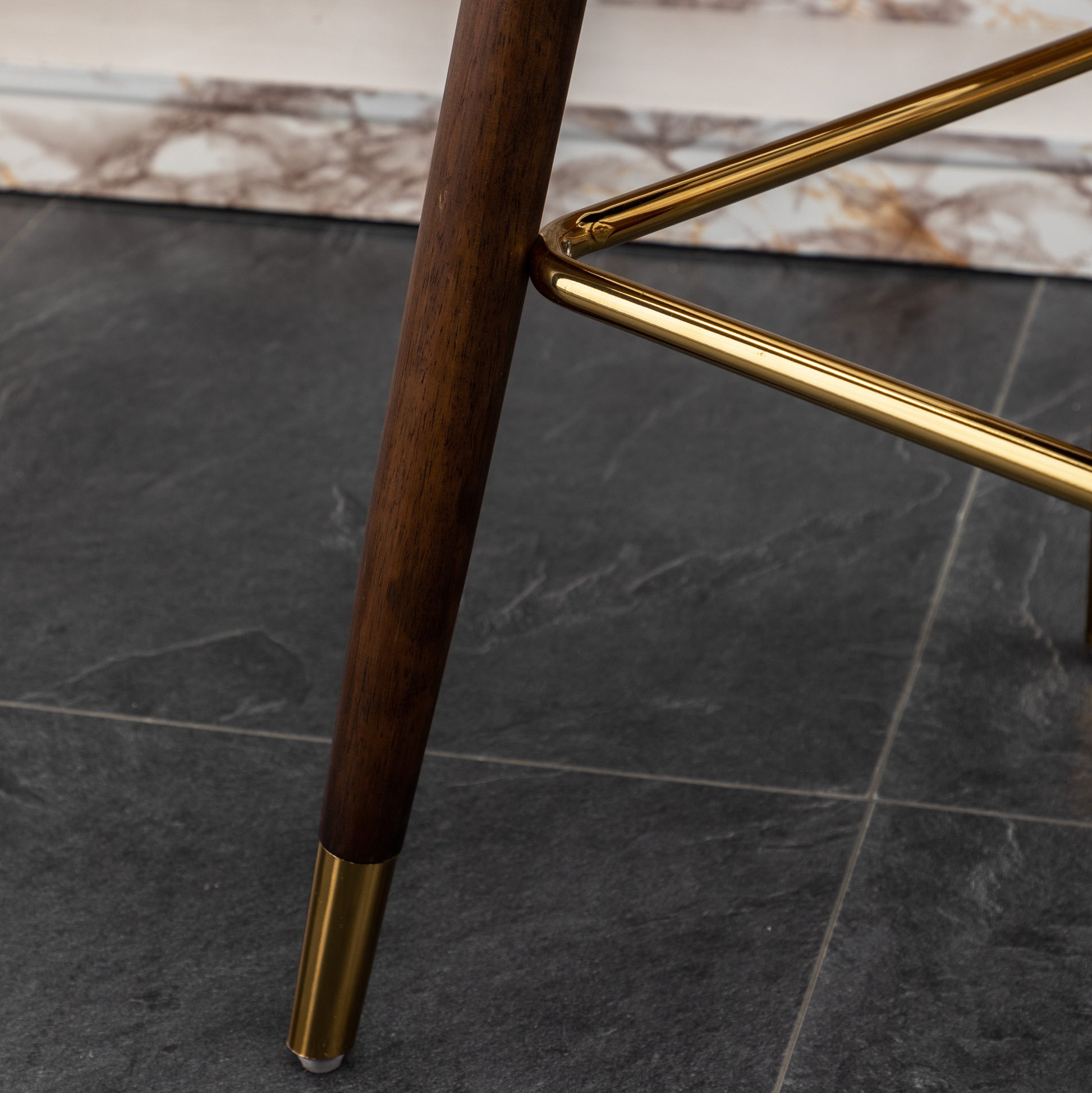- Tapered walnut finished solid wood dowel legs with gold-finished metal footrest