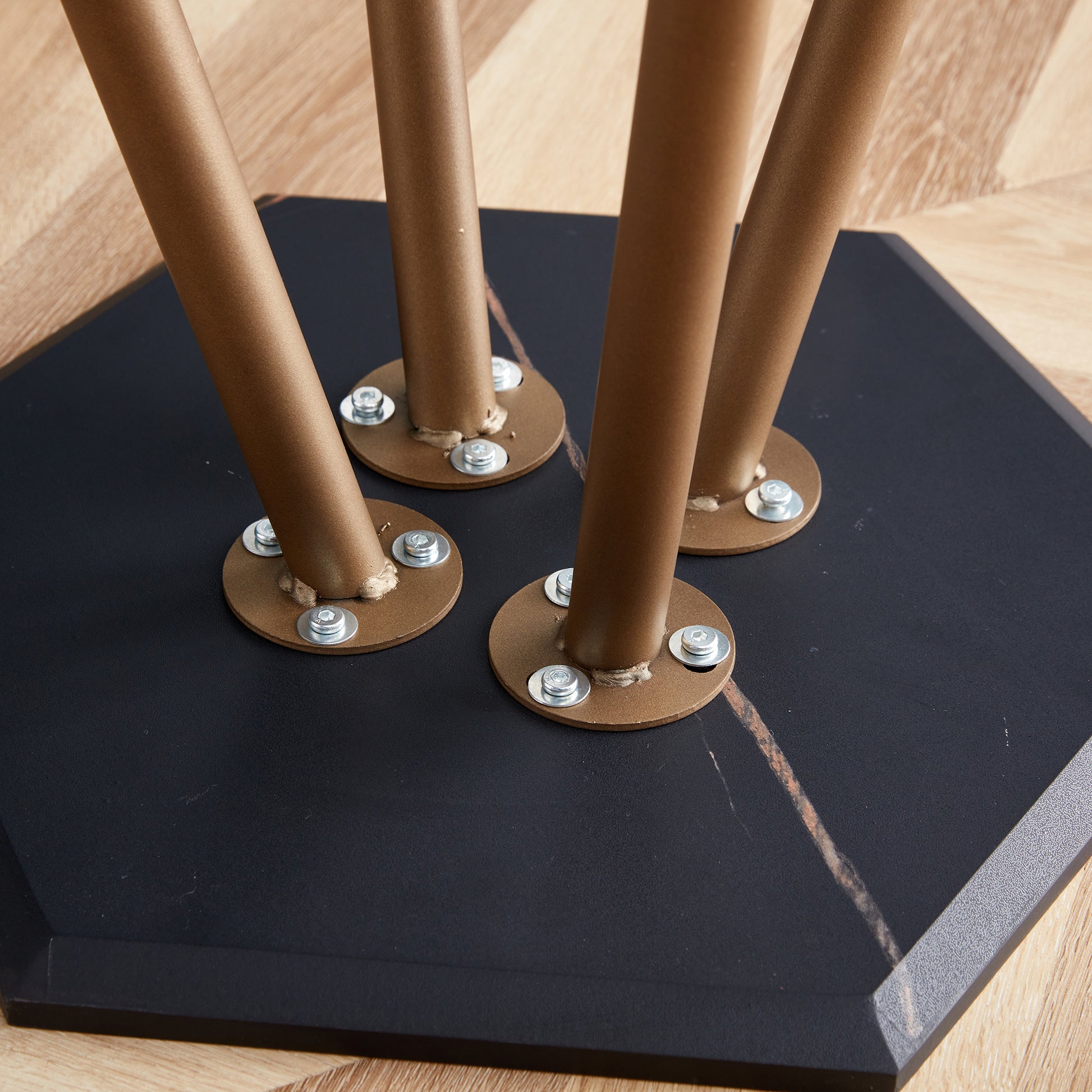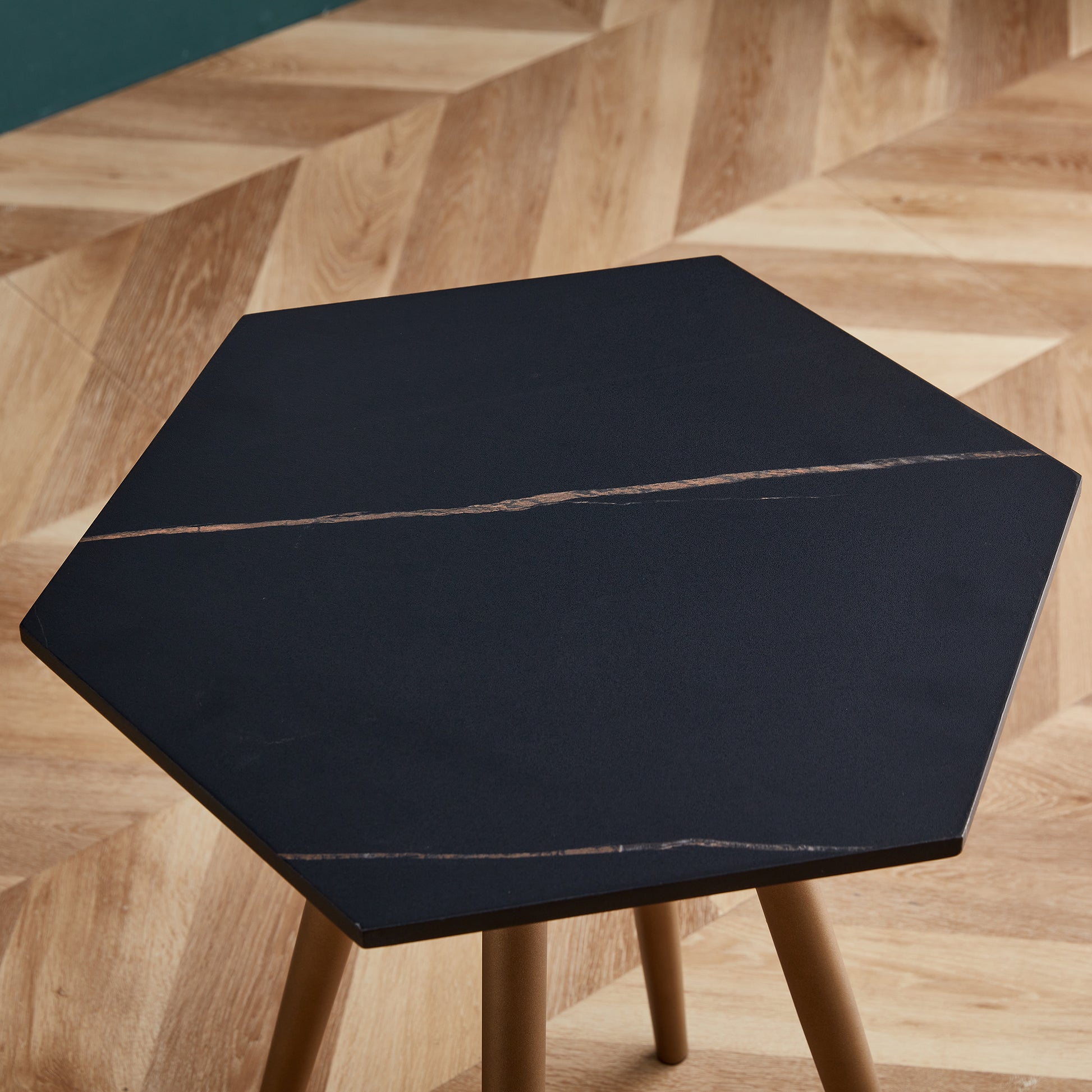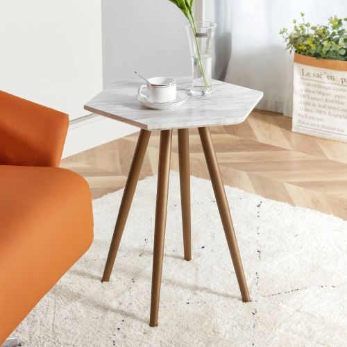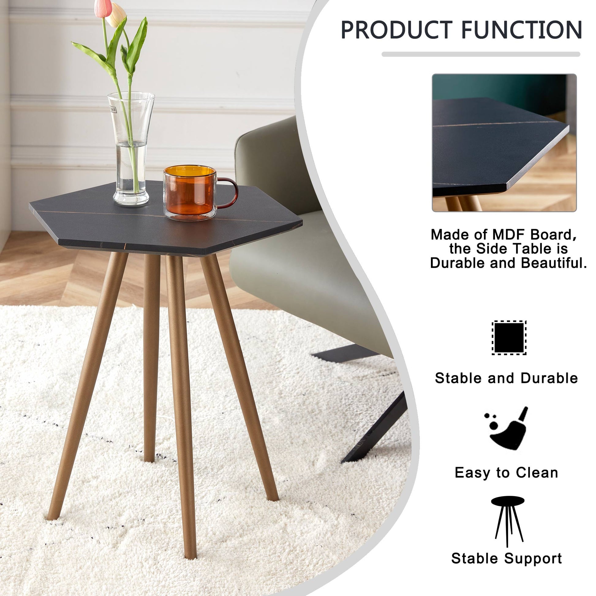 Product Name:Modern Minimalism Black Faux Marble End&Side Table, Small Accent Coffee Table with Dark Gold Metal Legs, Hexagon Nightstand for Living Room,Bedroom, Apartment Small Space ( MDF Tabletop + Metal Legs )