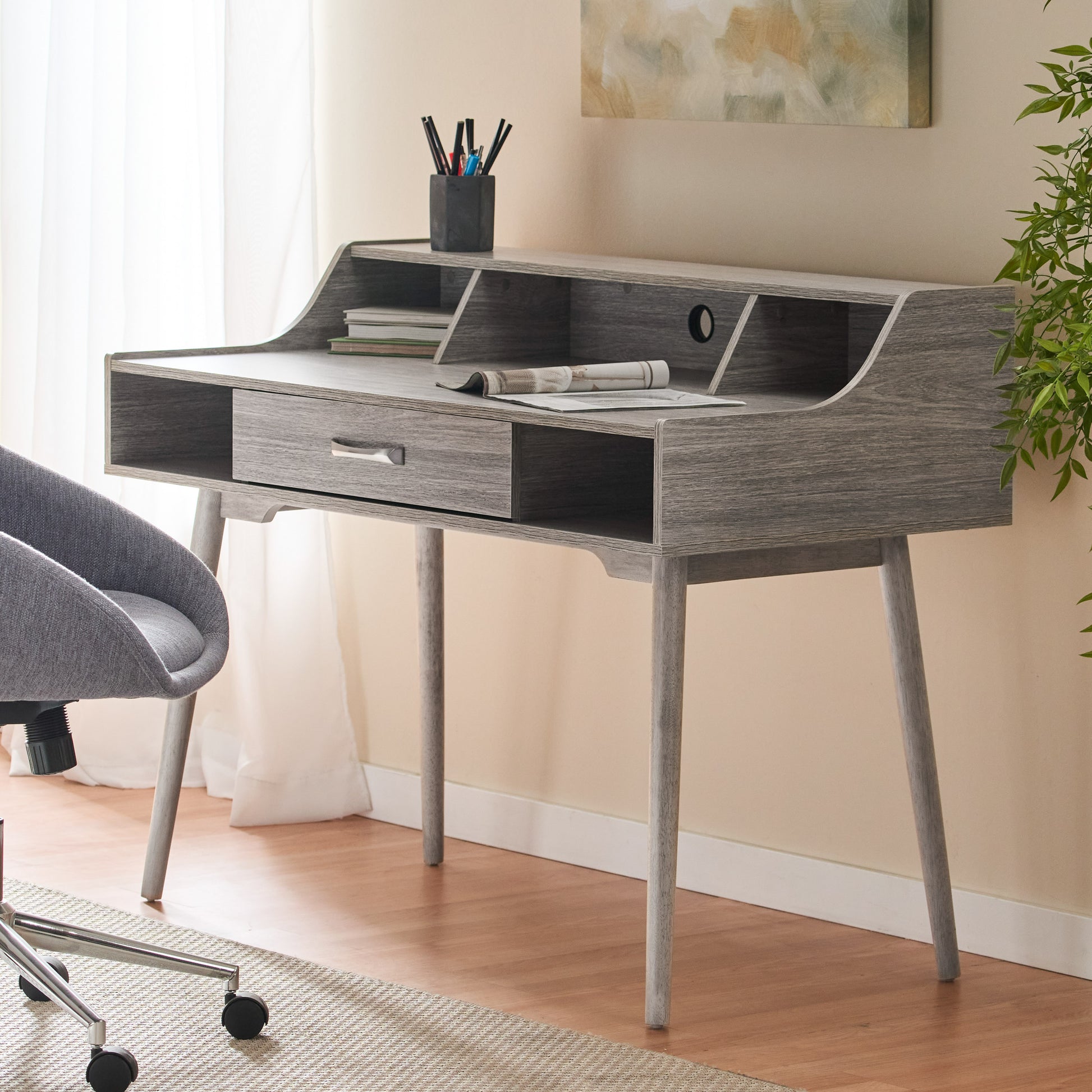 - This charming and functional midcentury modern desk is the perfect workstation for those who want to get things done in style. Perfect for any room or home office, it will allow you to keep everything you need for your work organized while looking great at the same time. A purchase you’re sure to treasure.