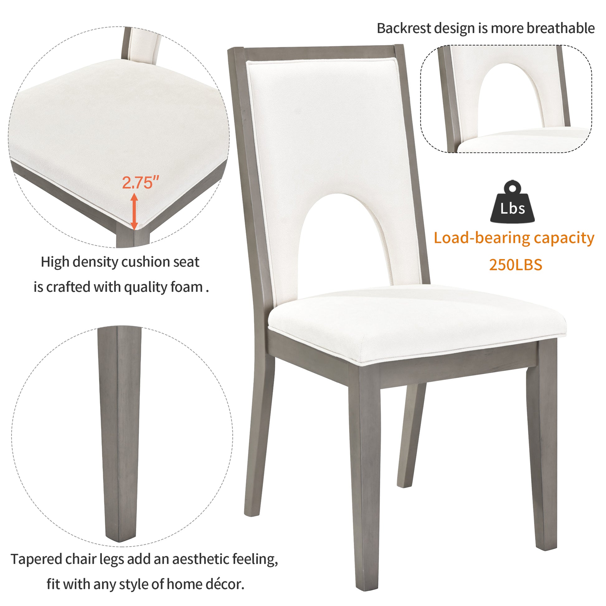 - The high density cushion seat is crafted with quality foam for extended comfort while featuring a 2.75-inch thickness, offer a soft seating experience for you to enjoy a meal in a relaxed status. Thick upholstered backrests of chair sets are in line with ergonomic design, thus bringing superb comfort. Tapered chair legs add an aesthetic feeling, fit with any style of home décor. Perfect for family meals or gatherings in your dining room or kitchen.