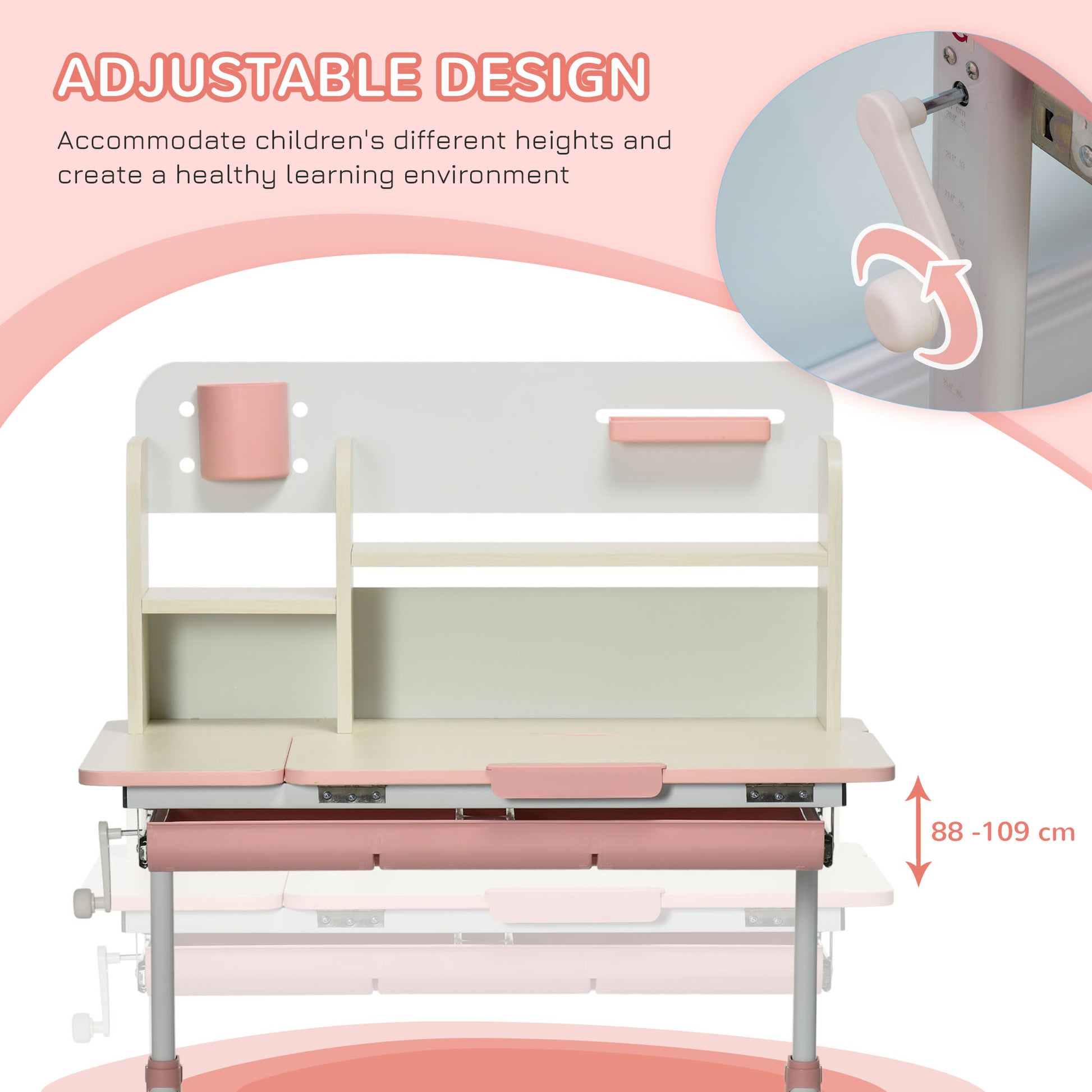 Product Name:Wooden Kids Study Desk, Height Adjustable Children School Study Table, Student Writing Desk with Tilt Desktop, Drawer, Storage Shelf, Pen Holder, Pink